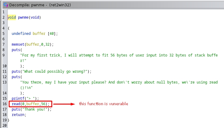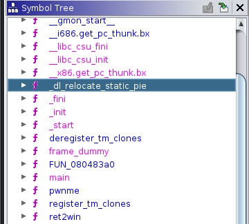 where the main is the entry and pwnme is the vulnerable function and ret2win is the function that will print the flag