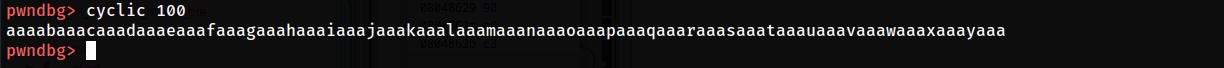 cyclic generates a char pattern that will help us identify the the offset to the EIP in this case we're generating a 100 char pattern because we know that less than 100 is enaugh to crash the binary and overwrite the EIP